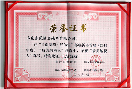 近日,臨沂市首屆“最美納稅人”評(píng)選頒獎(jiǎng)盛典在臨沂市廣播電視臺(tái)舉行。山東泰盛恒房地產(chǎn)有限公司獲此殊榮。